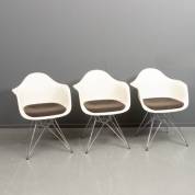 Drie witte kunststof kuipstoelen met zwart wollen kussens, staand op verchroomd draadstalen onderstel, model DAR, ontwerp Charles en Ray Eames, uitvoering Vitra, 80 x 63 x 60 cm
