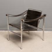 Chromen armstoel met donkerbruin tuigleder, model LC1, reproductie naar ontwerp van Le Corbusier -gebruikssporen-, 63 x 61 x 62 cm
