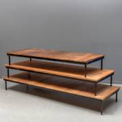 Drie tropisch hardhouten lattenbanken met zwart stalen frames, 27 x 219 x 70,5 cm