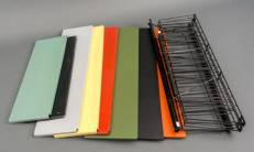 Gekleurd metalen wandrekje, bestaande uit acht plankjes en vijf muurbeugels, uitvoering Tomado