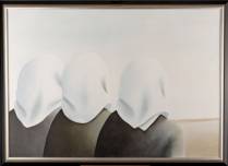 Michèle Lehmann (1940), drie figuren met witte kappen over het hoofd, olieverf op doek, gesigneerd, 64 x 91 cm