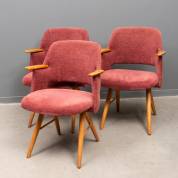 Serie van drie eiken armstoelen met rode bekleding, circa 1960, 80 x 59 x 60 cm