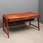 Teakhouten schrijfbureau met drie lades en in het werkblad drie opbergvakken, ontwerp Clausen & Maerus, uitvoering Eden, Nederland, circa 1960 - brandplekken in blad en gebruikssporen-, 78 x 149 x 86 cm