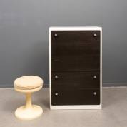 Kunststof en MDF toiletmeubel met zwart front, achter de draaideur een spiegel en opberglade, daaronder twee lades, circa 1970, daarbij: wit kunststof krukje met faux bont bekleding, 126 x 80 x 43 cm