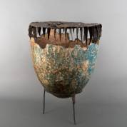 Groot aardewerk half-eivormig sculptuur met opgewerkt messing deksel, staand op gepatineerd messing driepoot, derde kwart 20e eeuw -randschilfers, en vier tanden van deksel afgebroken-, 72 x Ø 60 cm