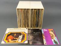 Paar kunststof verzamelbakken met lp's, waaronder: Louis Armstrong, Simon & Garfunkel, etc.