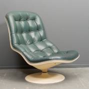 Witte kunststof fauteuil met groen lederen gecapitonneerde zitting, staand op draaibaar en achteroverklapbaar onderstel, model Shelby, ontwerp Georges Vanrijk, uitvoering Beaufort, België, circa 1970 -gebruikssporen, corrosie aan capitonneerknoopjes-, 92 x 67 x 90 cm