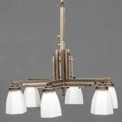 Zeslichts kroonluchter van donker- en lichtgrijs metaal, met opaline kapjes, art deco, 60 x Ø 66 cm