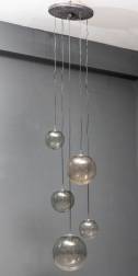Vijflichts hanglamp bestaande uit vijf rookglazen bollen van verschillende grootte aan verchroomd stalen armaturen, hangend aan zwarte houten plafondplaat, uitvoering Peill en Putzler, Duitsland, circa 1970, 270 x Ø 60 cm
