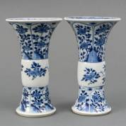 Paar Chinees porseleinen gu-vazen met blauw-wit floraal decor, gemerkt met artemisiablad, Kangxi -één gelijmd en haarlijn, de ander met twee bakfoutjes in de rand-, 17,75 cm
