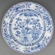 Chinees porseleinen schotel met blauw-wit decor van vaas met bloemen en bamboe, eerste helft 18e eeuw, Ø 31,75 cm