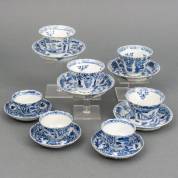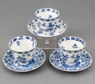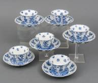 Zes Chinees porseleinen kommetjes en schoteltjes met gecontourneerde rand en blauw-wit bloemdecor, Jade gemerkt, Kangxi -één schoteltje gelijmd, één schoteltje haarlijn, één kopje haarlijn en chip, één kopje chip, verder minieme randschilfers-, 6 x Ø 14 cm