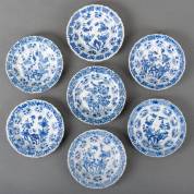 Zeven Chinees porseleinen schoteltjes met blauw-wit floraal decor, Kangxi -defecten-, Ø 12 cm