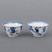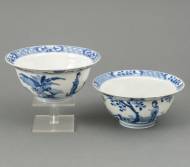 Paar Chinees porseleinen kommetjes met blauw-wit decor: ruiter te paard en vier figuren te voet, Chenghua gemerkt, Kangxi -één kom met miniem haarlijntje en enkele minieme randschilfers-, 3,5 x Ø 6 cm