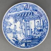 Chinees porseleinen bord met blauw-wit decor van figuren in een tuin, Yongzheng -gerestaureerde randchips-, Ø 22,5 cm