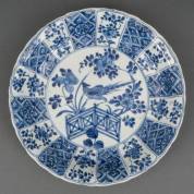 Diep Chinees porseleinen dubbelbord met blauw-wit decor van bloemen, vogel en tuinhek, gemerkt, Kangxi -randschilfers-, 4,25 x Ø 26,75 cm