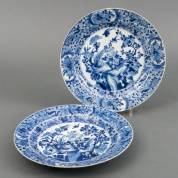 Paar Chinees porseleinen dubbelborden met blauw-wit decor van twee fazanten op een rotspartij, gemerkt, Kangxi -randschilfers en enkele haarlijnen-, Ø 28,5 cm
