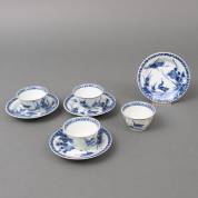 Vier Chinees porseleinen kommetjes en schoteltjes met blauw-wit decor van kraanvogels, Yongzheng -defecten-, Ø 11,5 cm