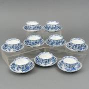 Negen Chinees porseleinen kommetjes en schoteltjes met blauw-wit bloem- en vogeldecor in bamboevormige cartouches, Jade gemerkt, Kangxi -randchipjes-, 7,75 x Ø 14 cm