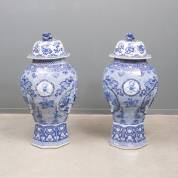 Paar kapitale Chinees porseleinen dekselvazen met blauw-wit decor: figuren, draken en lotusbloemen, modern -enkele glazuur chipjes van de tempelleeuwknoppen, en één deksel met grote haarlijn-, 108 x Ø 51 cm