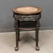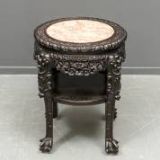 Gezwart houten plantentafeltje met roze marmeren blad en rijk gesneden bloem- en drakendecor, China, 60 x Ø 56 cm