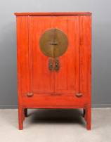 Chinese roodlak bruidskast met messing monturen, 19e eeuw, 173 x 110 x 59 cm