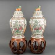 Paar Chinees porseleinen famille rose balustervormige dekselvazen met decor van hofhouding en vogels, de deksels met tempelleeuwen, staand op houten basementen, Kanton, 20e eeuw -één gelijmd-, 101 cm