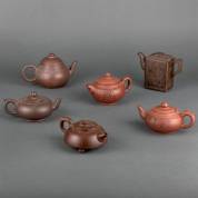 Zes Yixing theepotjes, waaronder één met inscriptie en één met visappliques -chipjes-