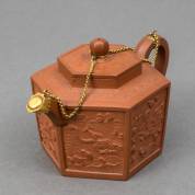 Hexagonale Yixing theepot met reliëfdecor van jagende draken, voorzien van verguld metalen monturen, circa 1700 -gelijmd handvat, stuk uit dekselrand, chip van tuit-, 14 x 15 x 8 cm
