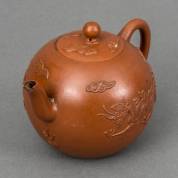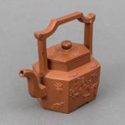 Yixing theepot met opstaand hengsel en reliëfdecor van jagende draken, circa 1700 -hengsel, tuit en deksel gelijmd, stuk uit binnenring deksel-, 8 x 14 x 8 cm