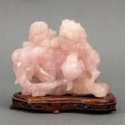 Rozenkwarts beeldje: twee tempelleeuwen vechtend met olifant, China, eerste helft 20e eeuw, 15,5 cm