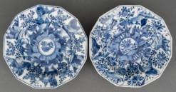 Paar octagonale Chinees porseleinen schoteltjes met blauw-wit decor, gemerkt, Kangxi -één gelijmd, één met randchips en haarlijn-, 3,5 x Ø 13,25 cm