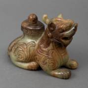 Chinees groen jade beeld: liggende qilin met dekseldoosje op zijn rug, 10,5 x 14 x 6,5 cm