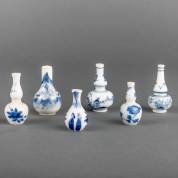 Vijf Chinees porseleinen miniatuurvaasjes met blauw-witte decors, 18e eeuw -defecten-, en één Chinees porseleinen miniatuurvaasje met blauw-wit landschapsdecor, Kangxi gemerkt, 19e eeuw