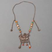Zilveren collier met halfedelsteen kralen met zilveren hanger in de vorm van een ruiter te paard, gemerkt, 34 cm