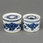 Zeldzaam Chinees porseleinen cilindervormig inktstel met blauw-wit wolkendecor, bestaande uit: inktpot -chips en barstjes-, en bijbehorende zandstrooier -bovenzijde is in het verleden eraf geweest en later gerestaureerd, chipjes-, beide gemerkt met artemisiablad, Kangxi, 5,25 x Ø 7 cm