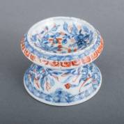 Chinees porseleinen Imari zoutvat met floraal decor, Qianlong -licht glazuurverlies langs de rand-, Ø 8 cm