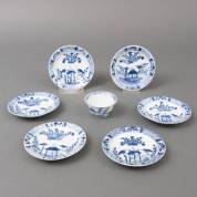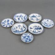 Zeven diverse Chinees porseleinen schoteltjes met blauw-wit figurendecor, Kangxi -defecten-