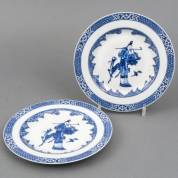 Paar Chinees porseleinen borden met blauw-wit decor: vrouw met bloemenmand en ree, 19e eeuw -haarlijnen en chips-, Ø 22,5 cm