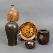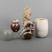 Beigegeglazuurde aardewerk vaas, uitvoering Zaalberg, grijs-groengeglazuurde sculptuur, gemonogrammeerd HA, bruin-groengeglazuurde vaas in de vorm van een vrucht met bladeren, niet gesigneerd, lusterglazuur raku keramiek dekselpotje, niet gesigneerd, en bol glazen vaasje met gekleurd spatdecor, onduidelijk gesigneerd