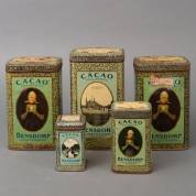 Vijf gelithografeerde voorraadblikken 'Bensdorp Cacao' -gebruikssporen-, 21 x 12 x 8,5 cm
