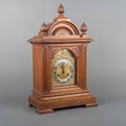 Tafelklok in eiken kast met messing wijzerplaat, slagwerk op gong, adres FHS, Duitsland, tweede helft 20e eeuw -stukje voet ontbreekt-, 56 x 23 x 20 cm