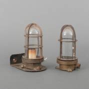 Twee messing en glazen lampjes, één op stalen wandbeugel, midden 20e eeuw, H 22 cm