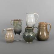 Vijf grijs-groengeglazuurde keramiek schenkkannen, waarvan vier gemerkt