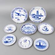 Acht Delfts aardewerk herinneringsborden met blauw-wit decor, De Porceleyne Fles -twee borden met chip-, Ø 26 cm