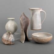 Grijsgeglazuurde keramiek schenkkan en schaal, gemerkt Rouhier, Beaune, Frankrijk, raku keramiek vaasje en sculptuur, en grijsgeglazuurd bol vaasje
