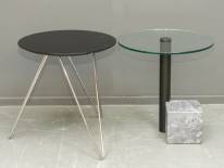 Ronde glazen bijzettafel met poot van zwartgelakt staal en een grijs marmeren kubus, postmodernisme, en rond bijzettafeltje met zwartgelakt houten blad, 21e eeuw, 54 x Ø 60 cm