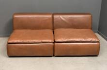 Paar bruine lederen bankmodules, vermoedelijk ontwerp Jan des Bouvrie, uitvoering Gelderland, circa 1975, 65 x 86 x 90 cm