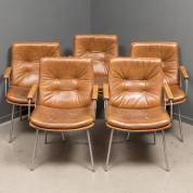 Serie van vijf armstoelen met bruine lederen bekleding, ontwerp Geoffrey Harcourt, uitvoering Artifort, jaren '60 -enkele capitonneerknopen ontbreken-, 88 x 60 x 66 cm