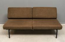 Zwartgelakte stalen slaapbank met vier losse bruin gestoffeerde kussens en wegklapbare rugleuning, circa 1970 -bekleding sleets-, 76 x 153 x 72 cm